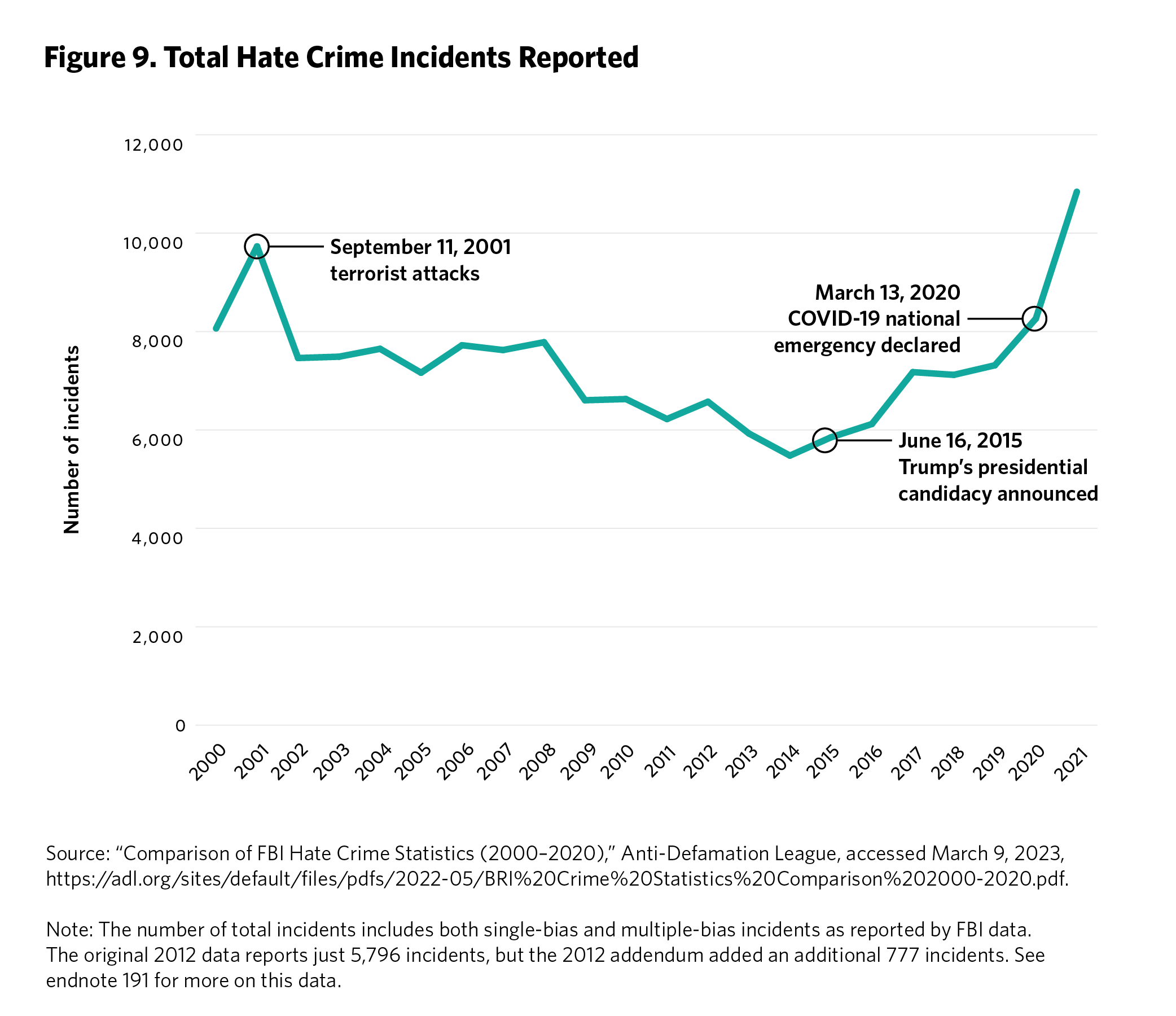 191 “Federal Bureau of Investigation Crime Data Explorer,” Federal Bureau of Investigation, accessed July 11, 2023, https://cde.ucr.cjis.gov/LATEST/webapp/#/pages/home. The FBI’s hate crimes data are notoriously poor because they rely on police agencies to self-report, and many do not. However, more departments have failed to report more recently, so these trends are likely to be even worse than the FBI statistics suggest, not better.